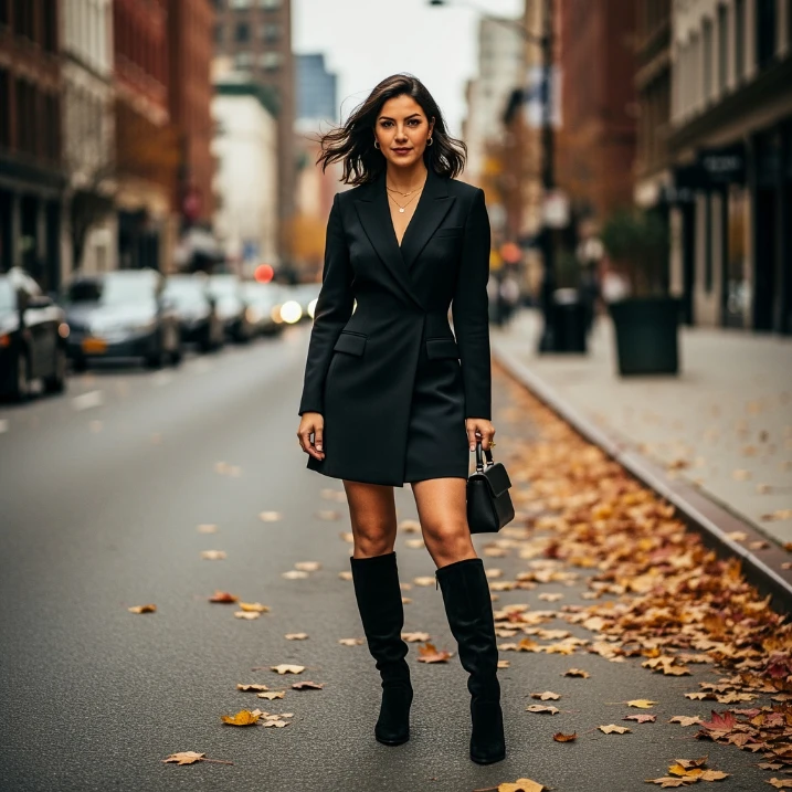 A blazer dress is a powerful yet feminine outfit choice for a fall date night. Its structured silhouette creates a polished look while remaining trendy and bold. Pair it with knee-high boots to add warmth and elongate your legs, making the entire outfit appear sleek and confident.