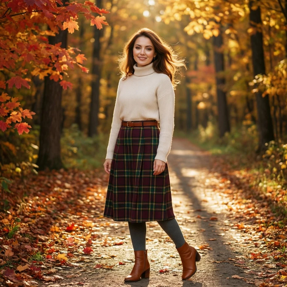 A turtleneck paired with a plaid skirt creates a classic fall look that never fails. The combination is both cozy and stylish, making it perfect for a romantic date night.