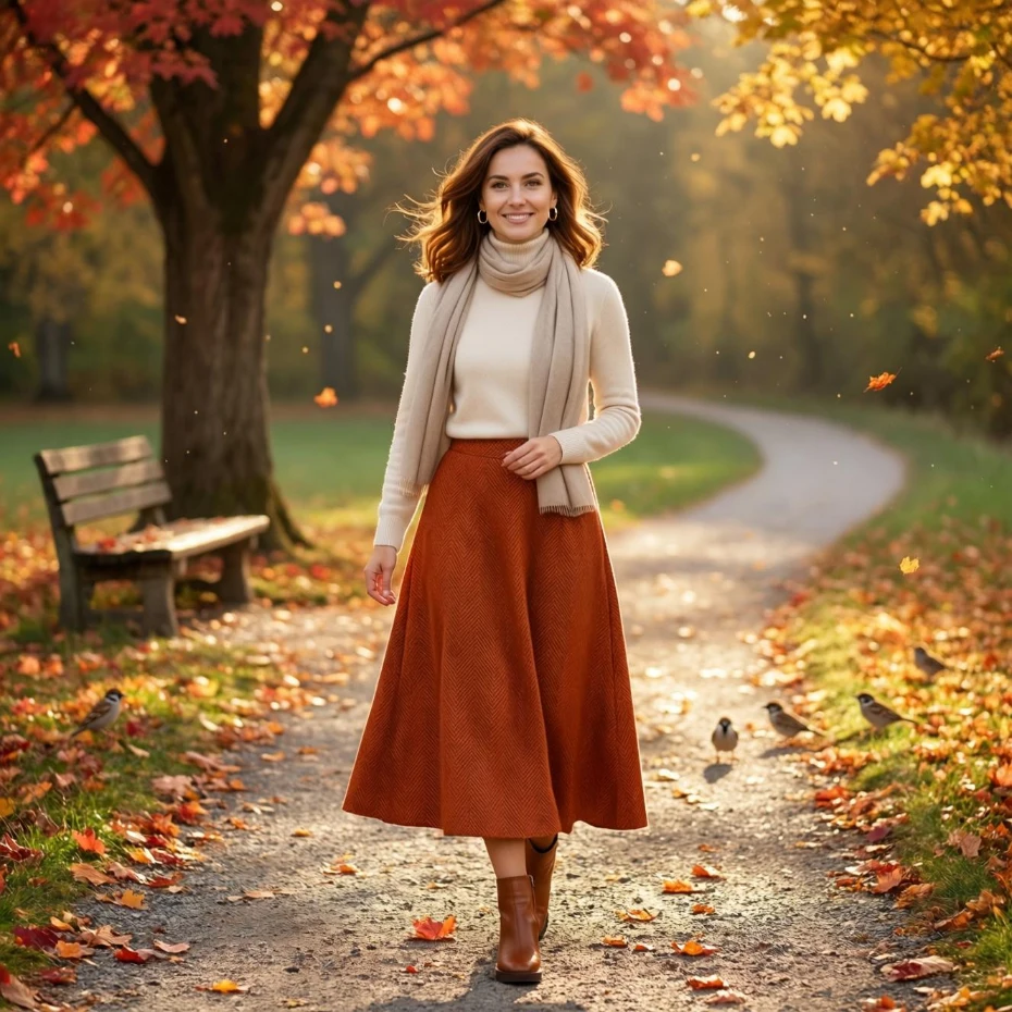 A midi skirt combined with a sweater creates a balanced and feminine look. The flowy silhouette adds movement and charm.