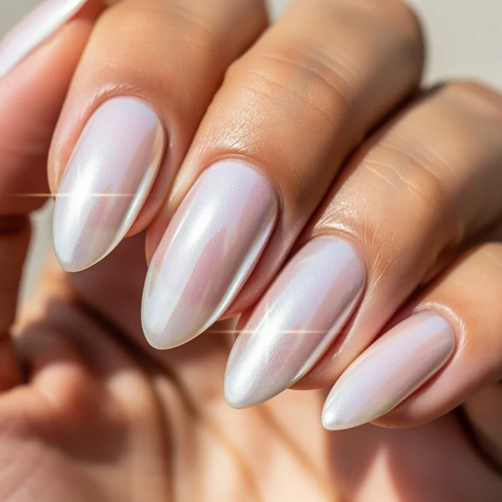 The glazed donut nail trend continues to dominate in 2026, bringing a soft, luminous shine that feels both clean and luxurious. This look features a sheer base layered with a chrome powder that creates a pearly, reflective finish. It’s subtle yet eye-catching, making it perfect for everyday wear or special occasions.