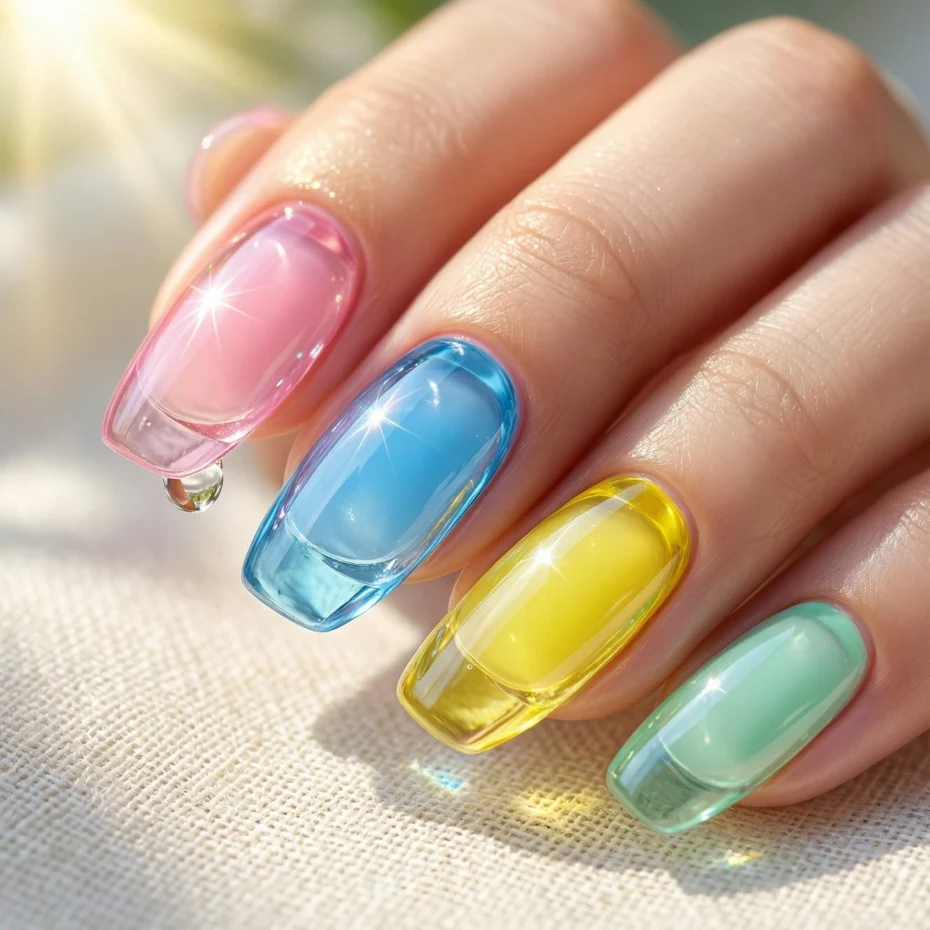 Jelly nails are all about translucent, glossy colors that resemble candy. They’re fun, vibrant, and perfect for warmer seasons.