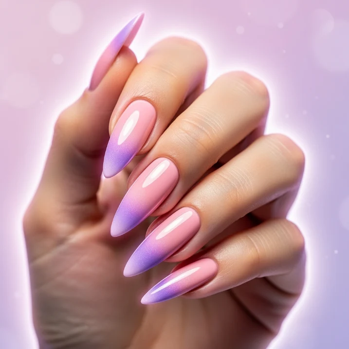 Aura nails are one of the most artistic trends of 2026, inspired by energy fields and soft color transitions. This style blends two or more shades to create a glowing, diffused effect in the center of the nail, giving it a dreamy, almost mystical vibe.