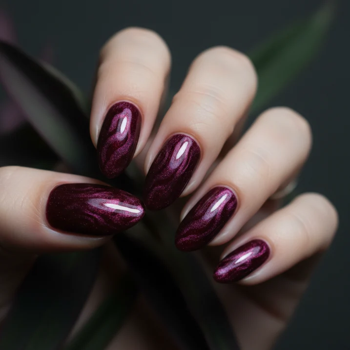 Velvet nails use magnetic polish to create a soft, shimmering texture that looks like fabric on your nails. The effect shifts with light, giving a luxurious and dynamic appearance.
