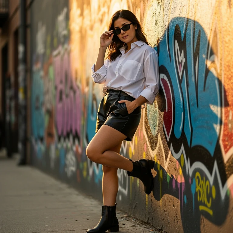 Oversized button-up shirts paired with leather shorts create a casual yet edgy baddie aesthetic. The contrast of soft cotton with edgy leather balances sophistication and street style effortlessly. Stick to neutral tones for a Pinterest-friendly look.