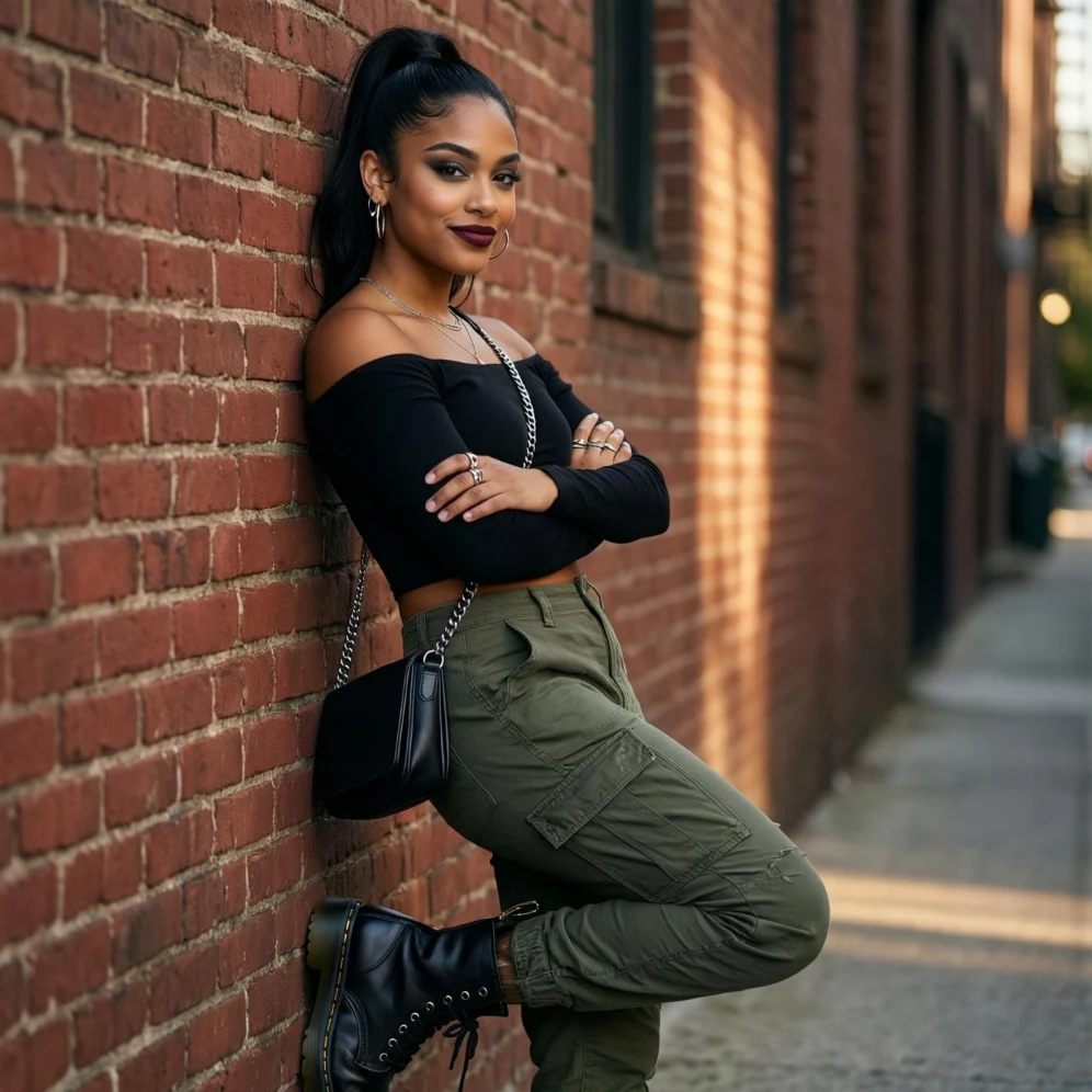 Off-shoulder crop tops paired with cargo pants merge sexy and street-style aesthetics. The fitted crop top highlights curves while cargo pants add an edgy utilitarian vibe. Neutral or muted colors are best for Pinterest-friendly visuals.