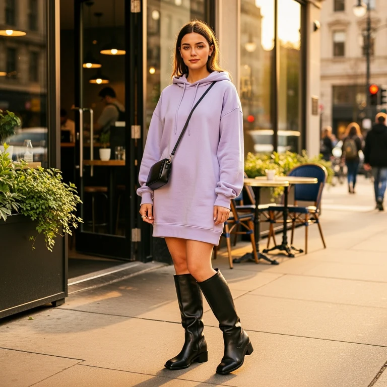 Hoodie dresses paired with knee-high boots create a casual yet stylish baddie aesthetic. The oversized fit provides comfort while boots elevate the outfit with chic vibes. Pastel tones are perfect for a Pinterest-worthy visual.