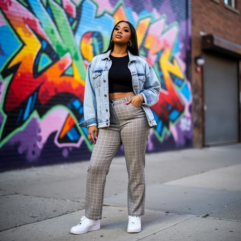 A denim jacket layered over plaid pants creates a balanced casual baddie look. The structured jacket adds chic layers while the plaid pants make the outfit edgy and Pinterest-worthy. Stick to neutral or pastel tones for cohesive styling.