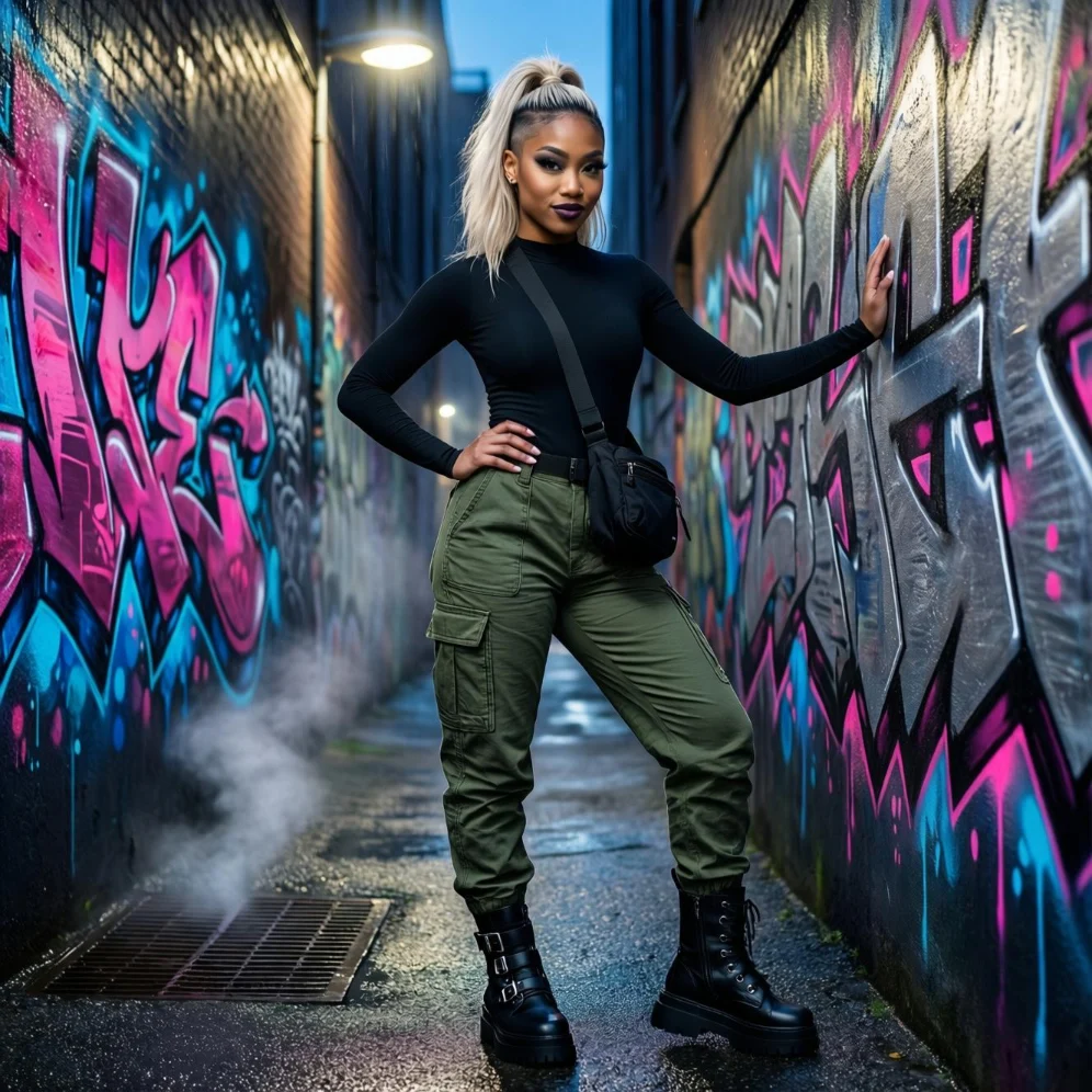 Add chunky boots and a belt bag to enhance the edgy casual look. Minimal jewelry like hoop earrings or layered chains completes the outfit effortlessly. Perfect for street photography, casual meetups, or fashion-forward errands around town.