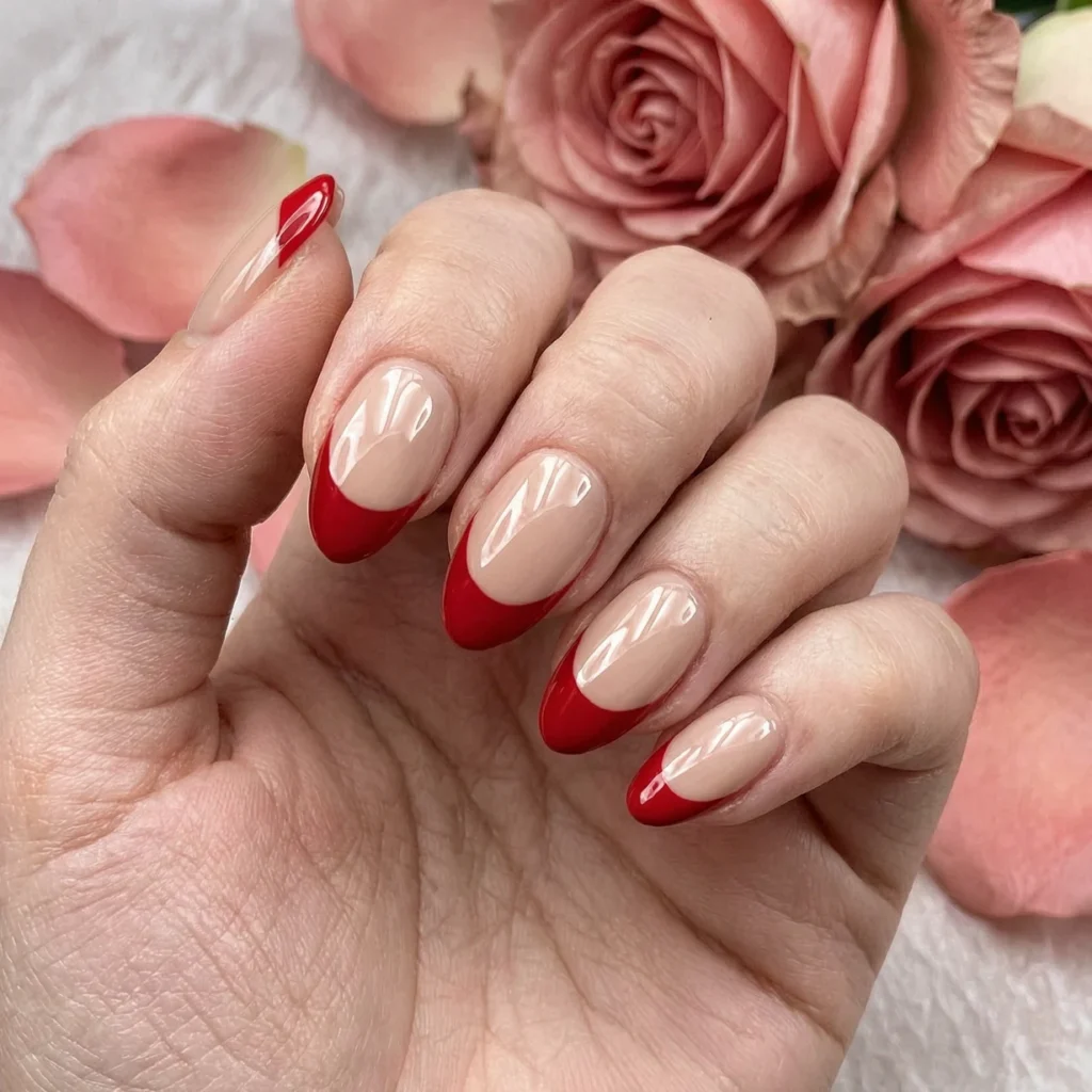 To elevate the look, you can opt for a glossy finish that enhances the richness of the red tips. Adding a slightly curved or heart-shaped tip variation gives a modern update to this traditional manicure. This style is easy to maintain while still delivering a bold and confident Valentine’s aesthetic that feels both chic and sophisticated.