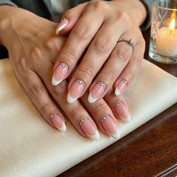 Rhinestone French tips are all about sparkle and glamour. Adding tiny crystals along the tips instantly elevates your manicure, making it perfect for special Valentine occasions. This design catches light beautifully and adds a luxurious touch.