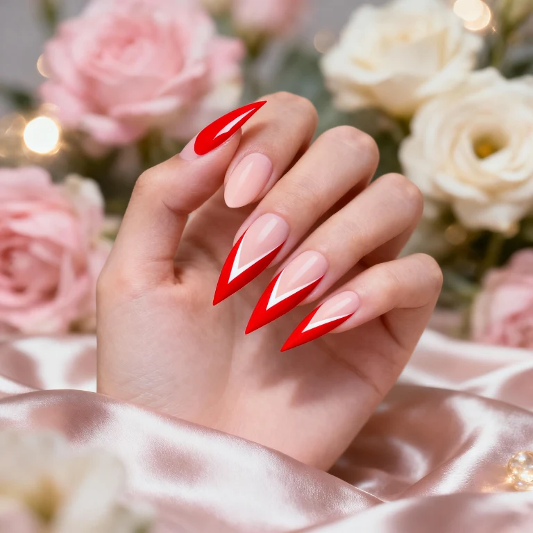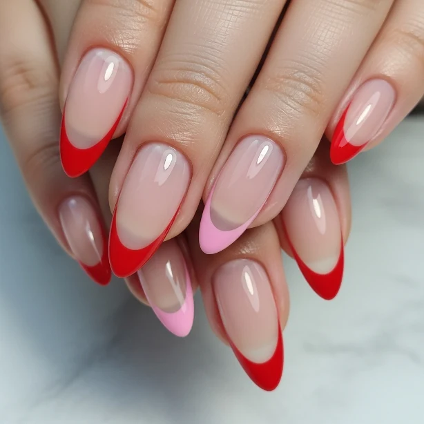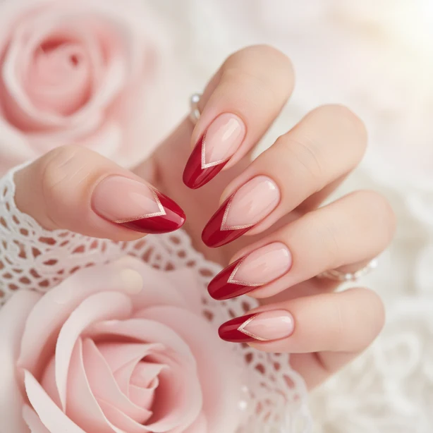 You can pair red or pink V-tips with a nude base for a balanced yet dramatic effect. The clean lines and unique shape make this design stand out, giving your Valentine manicure a modern and confident vibe.
