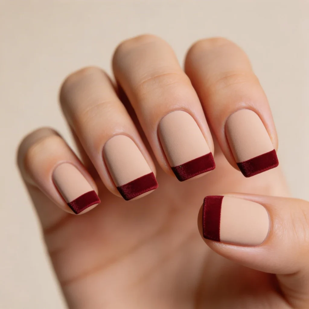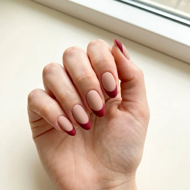 Deep Valentine shades like burgundy or dark pink work beautifully in a matte finish. The contrast between the matte base and bold tips adds visual interest, making your nails look stylish and refined. It’s a great choice for a chic and contemporary Valentine vibe.