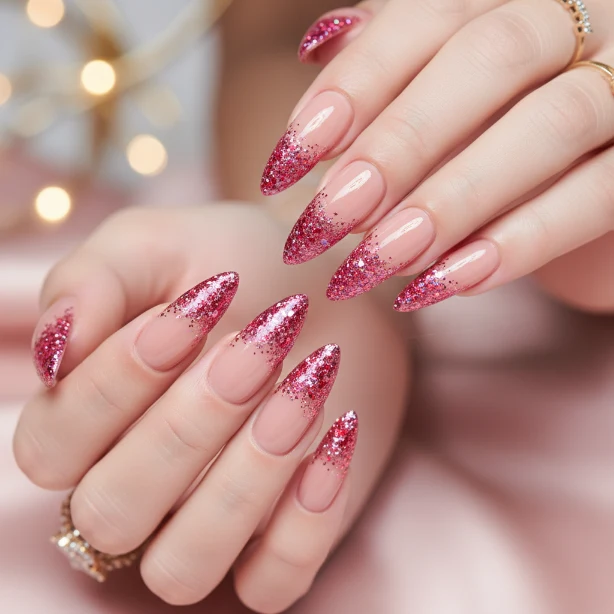 You can choose fine glitter for a subtle glow or chunky glitter for a bold statement. Pairing glitter tips with a nude or pale pink base keeps the look balanced and elegant. This nail style adds a festive and luxurious feel that perfectly matches the romantic energy of Valentine’s Day.