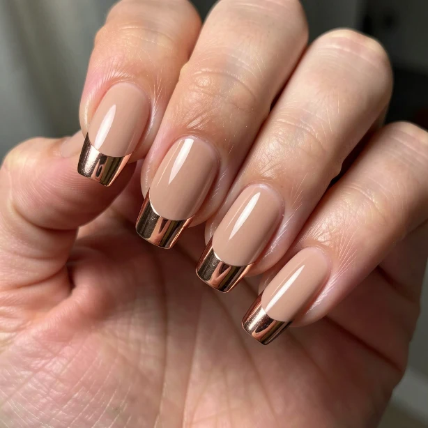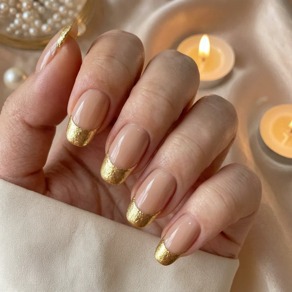 Pairing gold foil with a nude or blush base enhances the overall look, creating a warm and romantic vibe. This manicure is ideal for special occasions and gives your nails a rich, polished finish that feels both trendy and timeless.