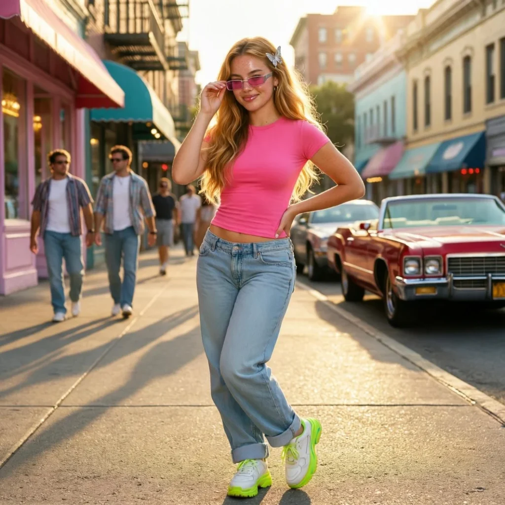 This outfit is highly versatile and easy to style with sneakers or platform shoes. Add accessories like a mini backpack or sunglasses to enhance the Y2K vibe. It’s an ideal look for those who love combining comfort with street-style fashion.
