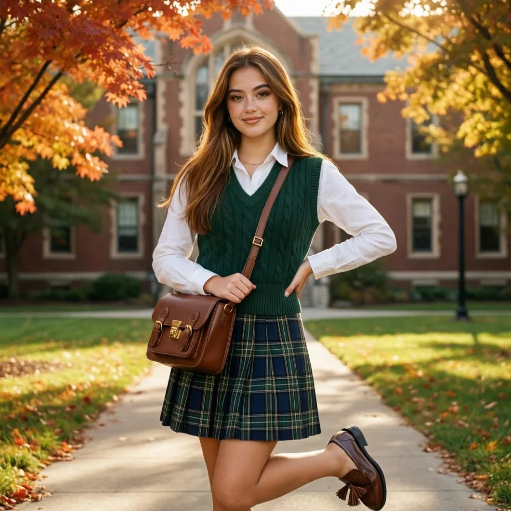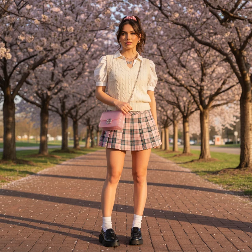 Pleated skirts paired with sweater vests create a preppy Y2K outfit that is both stylish and comfortable. This look is perfect for a polished and put-together appearance.
