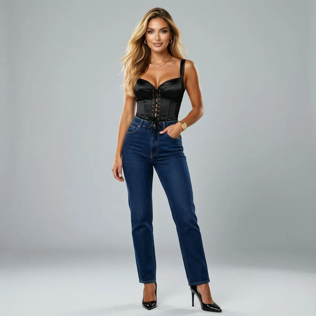 Jeans keep the look casual while the corset adds sophistication. Pair with heels or sneakers depending on the occasion. This outfit is perfect for a chic and trendy appearance.