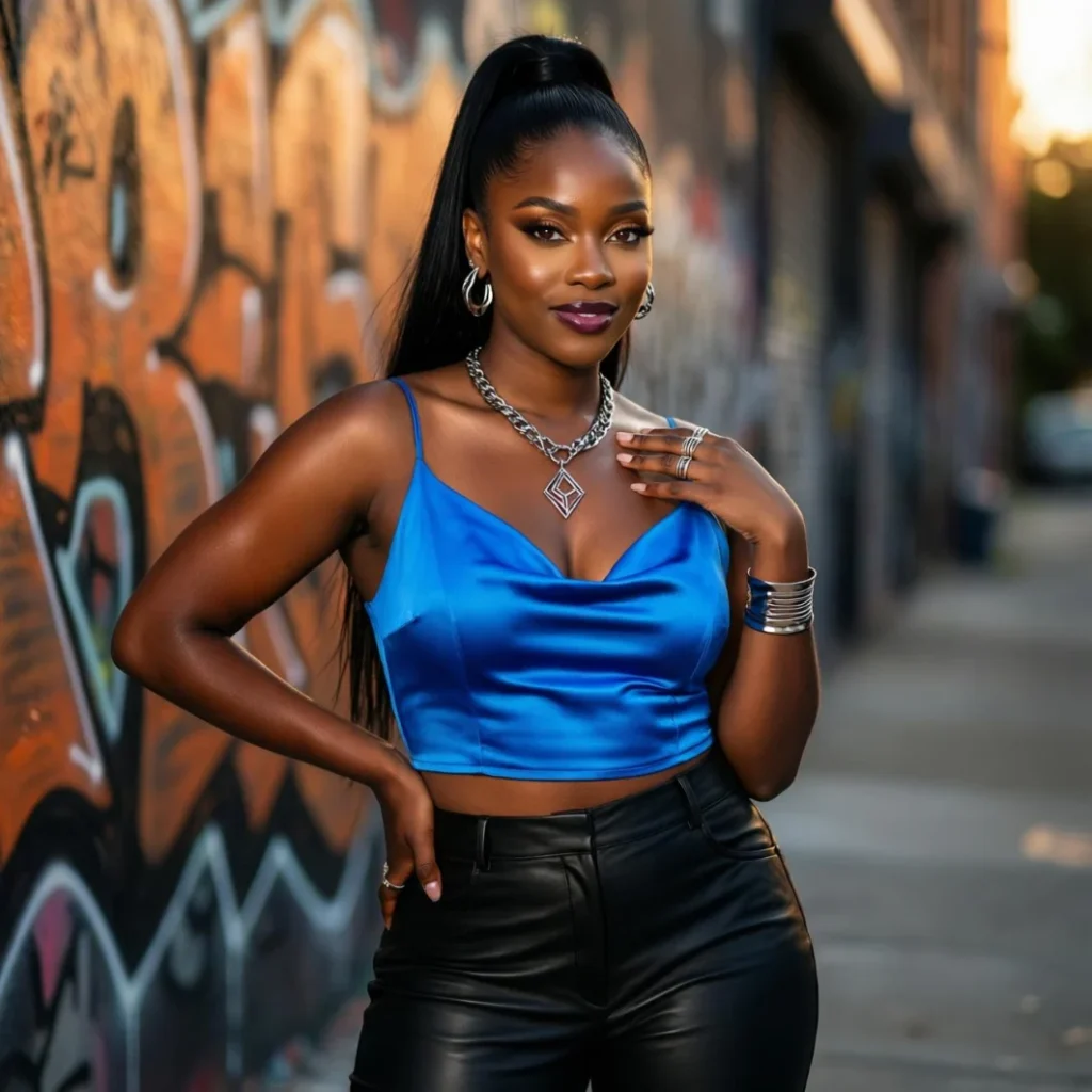 The contrast between casual and dressy elements adds interest to the look. Pair with bold accessories for a complete outfit. It’s a trendy and modern take on Y2K fashion.