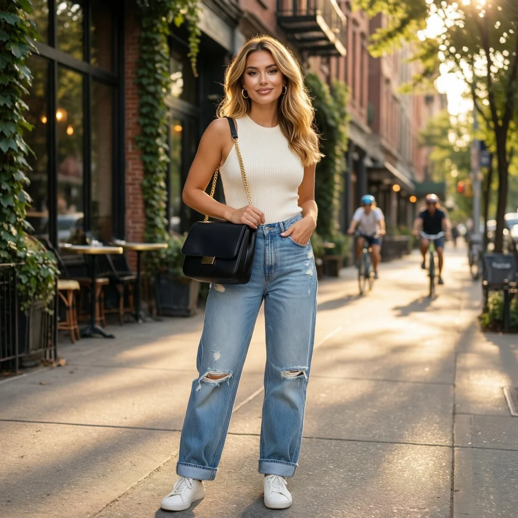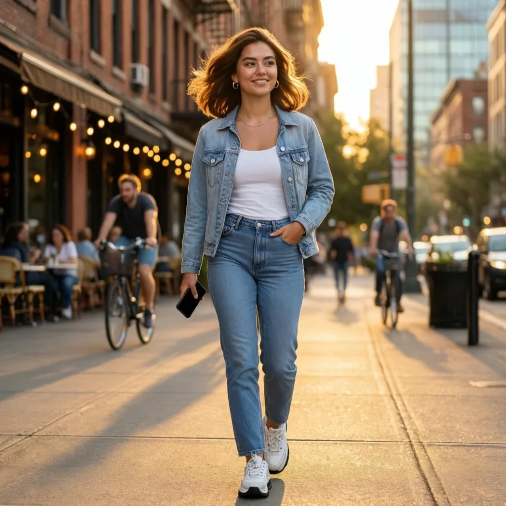 Pairing a denim jacket with jeans offers a structured yet relaxed style. Add a simple tank top underneath to balance the look. This outfit is perfect for streetwear lovers who want to embrace vintage-inspired Y2K trends with a contemporary twist.