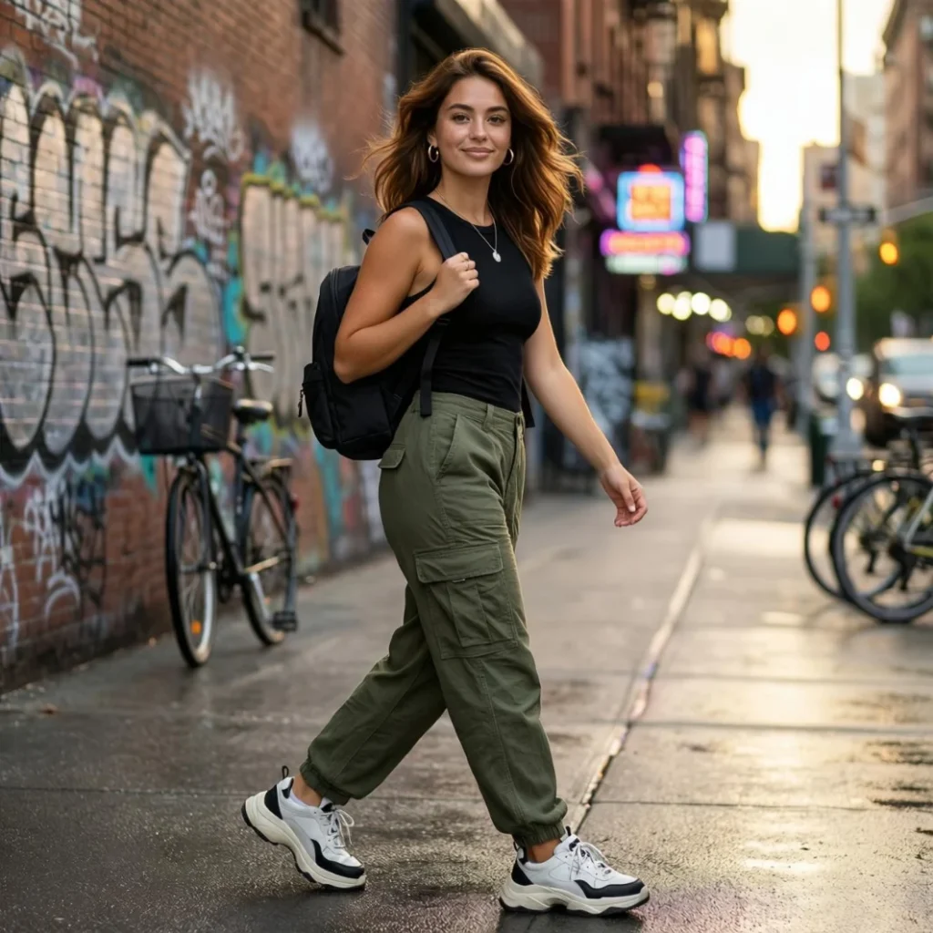 Cargo pants with a tank top create a relaxed yet trendy Y2K outfit perfect for everyday wear. The oversized silhouette of cargo pants adds comfort and utility, while the fitted tank top balances the look with a sleek touch.