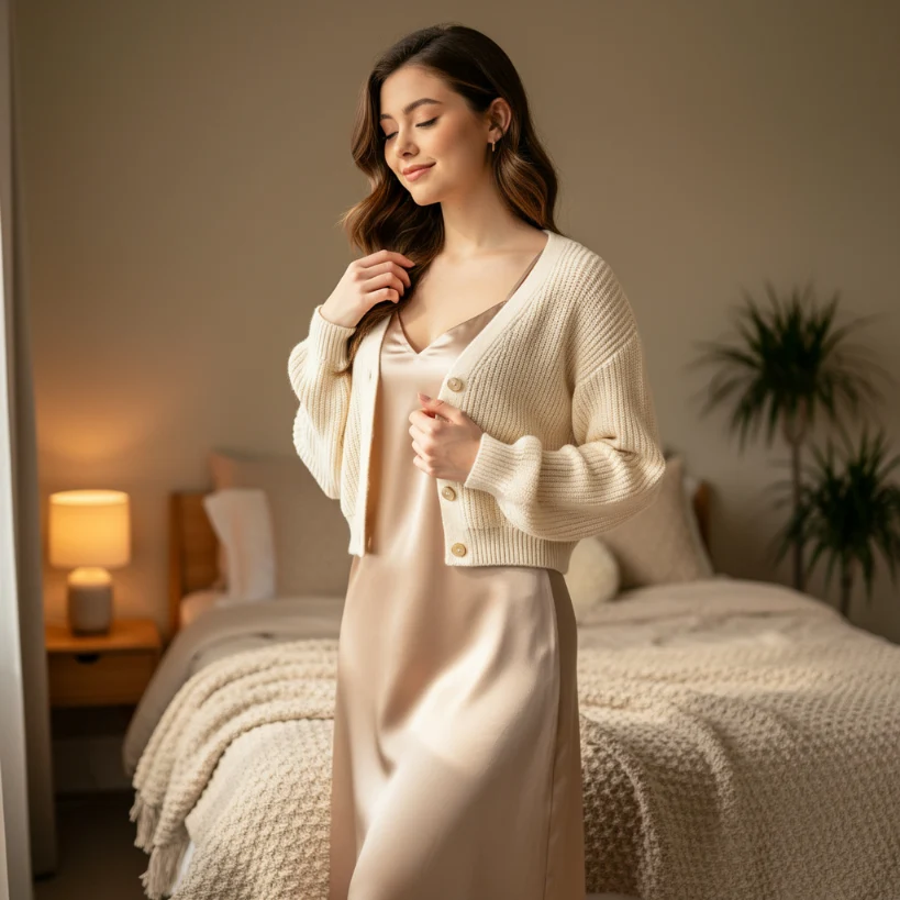 Slip dresses paired with cardigans create a soft and feminine Y2K outfit. This look is perfect for layering and works well for both casual and semi-formal settings.